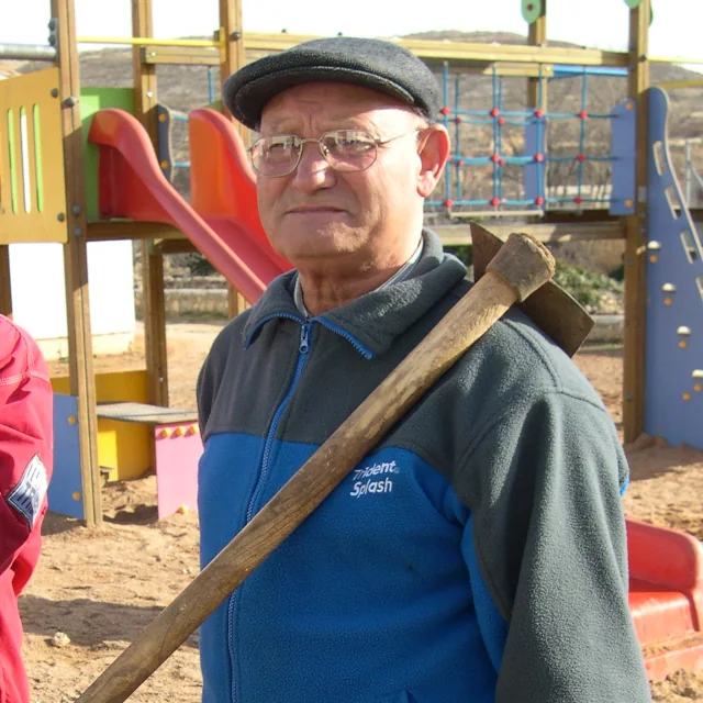 Ismael preparado para plantar árboles (en 2008) en el entorno de Blesa. También los plantó, cuando era joven, en los montes del término municipal.